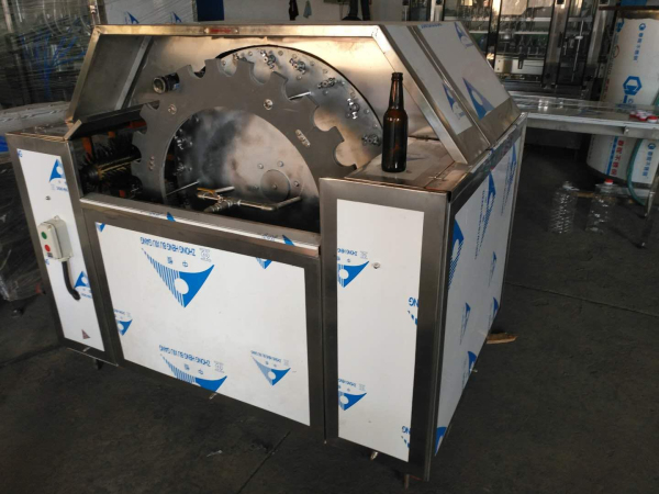 本機采用旋轉式,兩邊同時工作,瓶子進入內刷後,由內刷盤帶動瓶子旋轉。瓶子底部設有固定底刷,四周按有旋(xuán)轉外刷,並且裝有噴水頭,在刷洗瓶子內(nèi)部(bù)的同時,外部、底部、瓶口處(chù)都能同時清刷,從而達到一次性刷洗潔淨的目的,並可刷洗(xǐ)各種異型瓶。